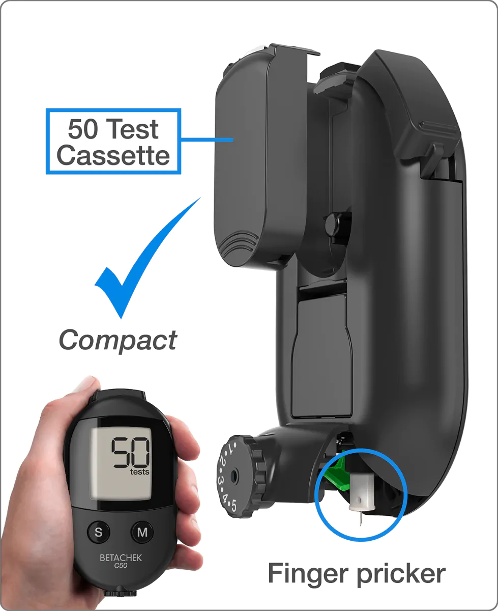The C50 blood glucose monitor has a built-in, precision engineered lancing device with 10 penetration settings to produce virtually pain free sampling. No more juggling multiple items such as fingers prickers and test strip containers. The lancing device uses the BETACHEK C50 disposable lancet and has an ejection mechanism for changing the lancet.