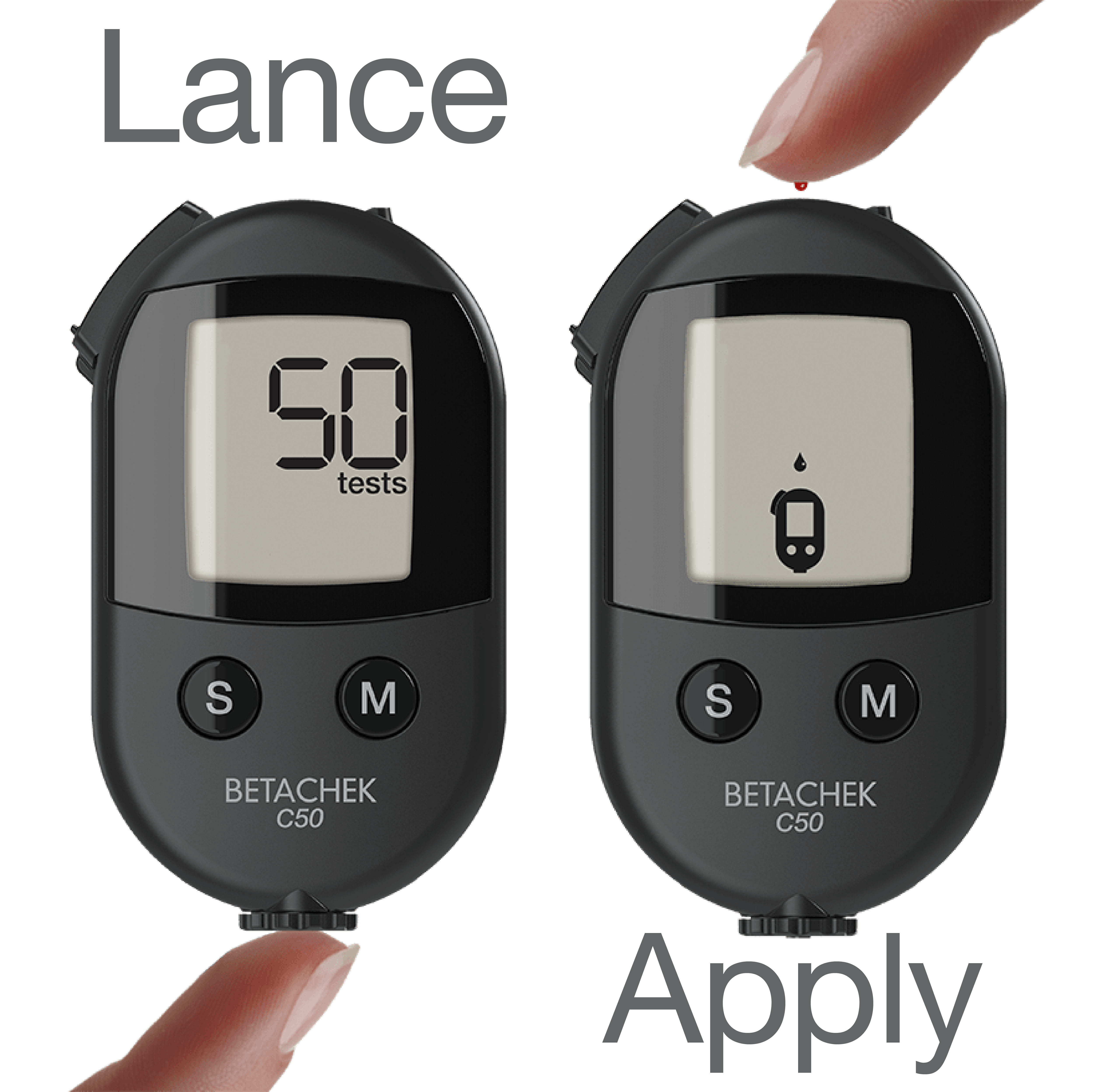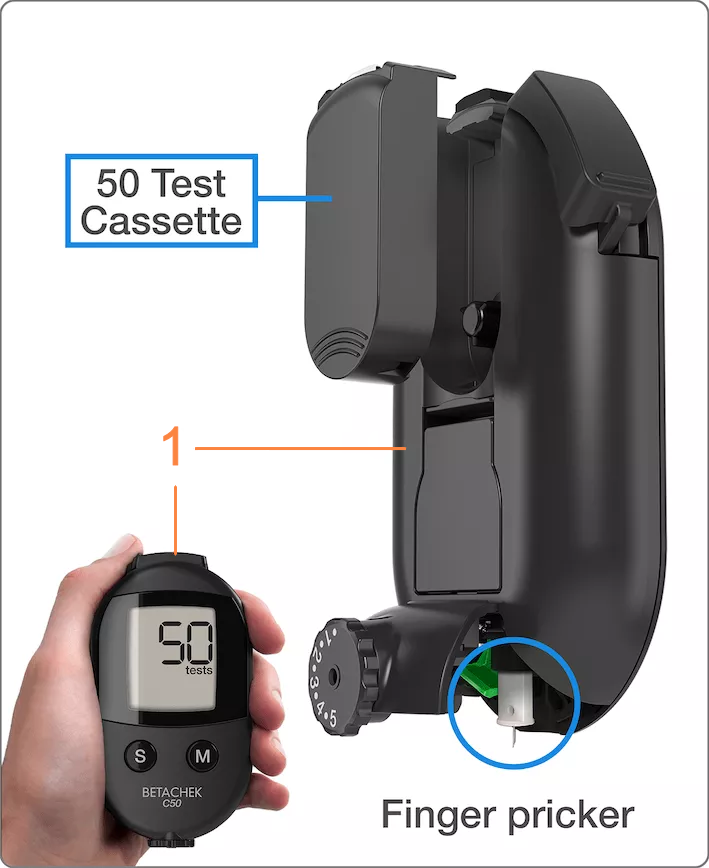 | BETACHEK C50: Each cassette has 50 tests. A lancet is loaded into the lancing device which has 10 penetration settings. |