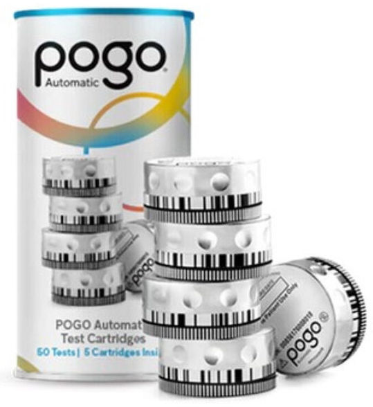 | POGO: A Pogo pack contained 5 cartridges with 10 tests each. Each test had a spring loaded hollow needle. |
